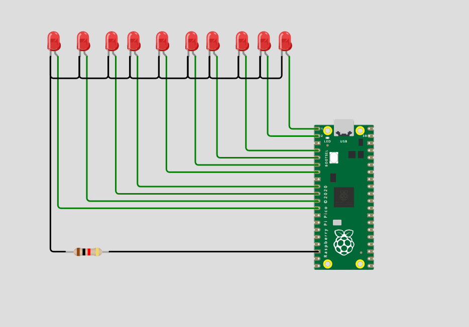 - Kết nối chân dài (chân dương, anode) của các LED với một chân GPI0 - GPI9 của Raspberry Pi Pico